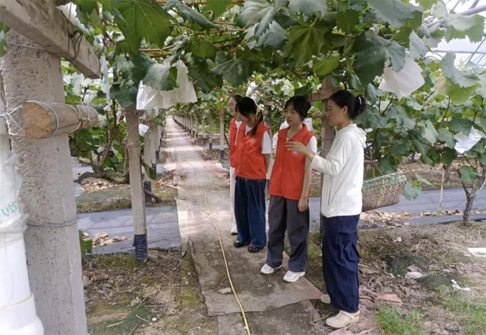 (圖馬路健康葡萄園負(fù)責(zé)人向?qū)嵺`團(tuán)講解園區(qū)內(nèi)設(shè)施)