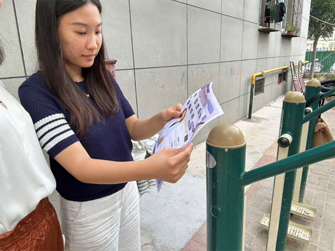 活動現場,志愿者帶好提前準備好的健身指南、視頻二維碼等,在工作人員的引領下,興高采烈地來到了活動場地,趕在下午晚飯前對場地進行規劃和布置,以萬全的準備迎接飯后運動的居民們。
