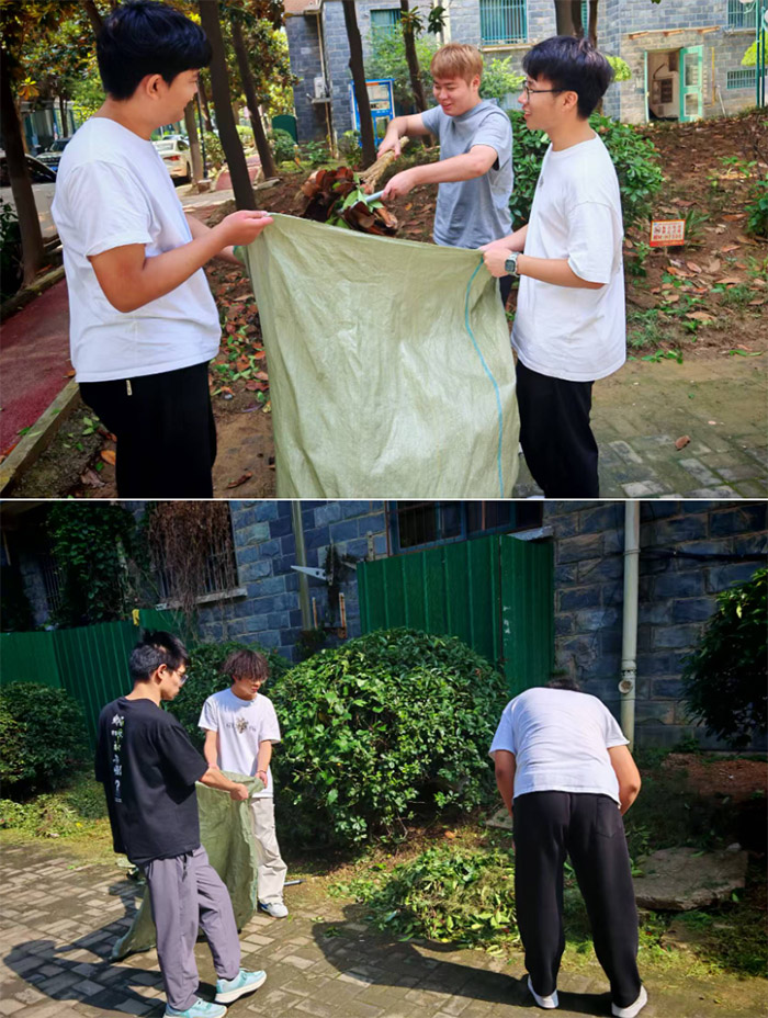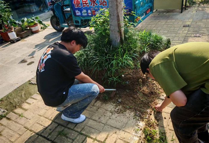 綠化帶整理組戴著手套拔除雜草、撿拾枯枝,將散落的塑料袋、飲料瓶等垃圾分類裝入環(huán)保袋,手持小鋤頭,對(duì)綠化帶內(nèi)的雜草進(jìn)行地毯式清除。