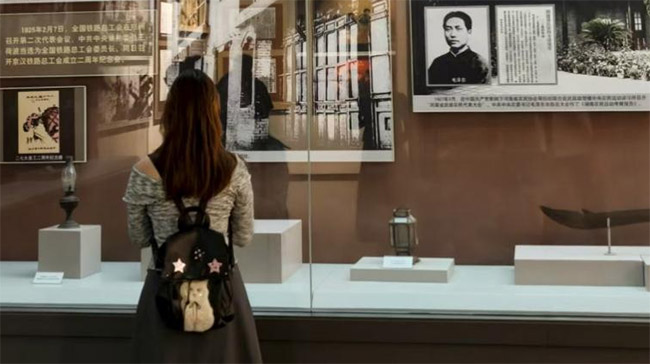 “白馬飾金羈”社會實踐團隊員在二七塔內(nèi)觀看影像解說
