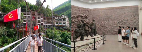 實踐隊走過紅軍索橋            實踐隊參觀先輩雕像