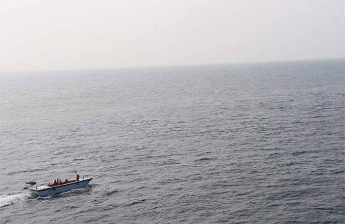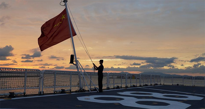 圖為海軍軍醫(yī)大學學員在88艦上的升旗儀式