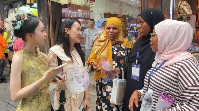 圖為“簪銀承閩韻,青鋒踐她行”實踐團向外國友人介紹三條簪文化。