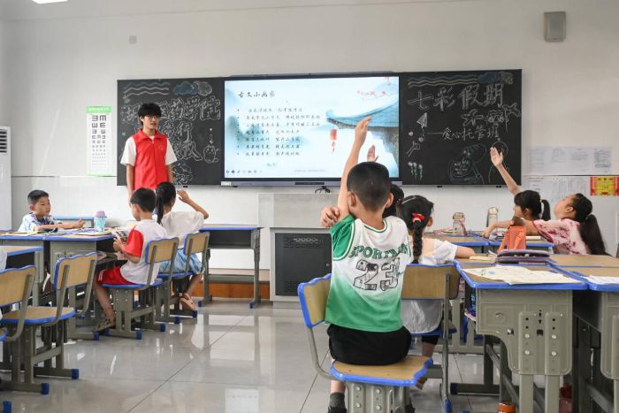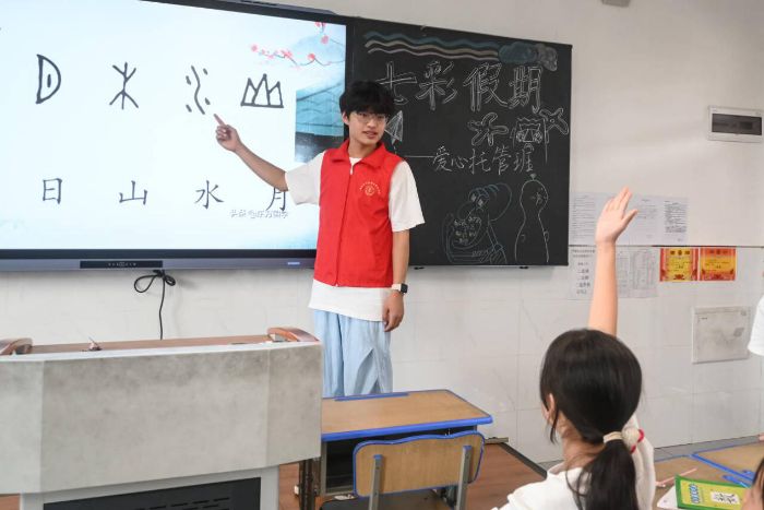 隨后的古文賞析環節,實踐隊隊員們選取經典篇目,用生動講解與趣味聯想,帶孩子們領略古文之美。從象形文字的奇妙演變,到古詩意境的沉浸式感悟,將傳統文化基因融入互動教學,讓晦澀知識變得鮮活,孩子們踴躍發言,分享對古文的理解,課堂氛圍熱烈。