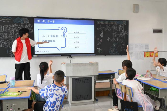 課堂上,身著紅色志愿服的實踐隊隊員們,先以“祖國旗幟在我心”開啟紅色文化課程。從國旗的歷史意義,到黨旗、團旗、隊旗的象征內涵,通過PPT展示、知識問答互動,引導孩子們了解旗幟背后的紅色故事,激發愛國愛黨情懷,稚嫩的小手紛紛舉起,搶答聲此起彼伏 。