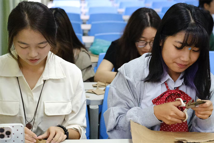 參與活動的同學的臉上都洋溢著對非遺文化喜愛與欣賞的笑容,在制作繡球與花草燈時出現不理解的制作步驟,同學們也會相互問詢,互幫互助,增強班級凝聚力,展現了青年學子的創造力與團隊合作精神,也激發了同學們的民族自豪感和愛國情懷,更加展現了非遺文化在新時代的精神動力。