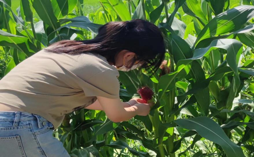 圖為實踐隊員在津南區摘玉米。中國青年網通訊員 王雨彤 攝
