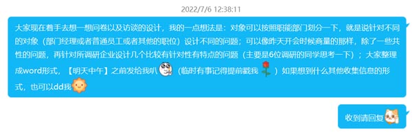 隊(duì)長總結(jié)會(huì)議內(nèi)容并布置下一階段任務(wù),由團(tuán)隊(duì)所有成員共同思考調(diào)查問卷和訪談稿的設(shè)計(jì);在整理出書面形式的調(diào)查問卷和訪談稿后,隊(duì)長進(jìn)一步部署調(diào)研成員開展后續(xù)調(diào)研活動(dòng)。