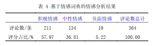 第二項是情感傾向性分析,調研組組員利用ROSTCM軟件自帶的詞典,再加入部分從評論數據中抽取的高頻情感詞,對處理后的評論數據進行賦分,得到基于情感詞典的情感分析結果。