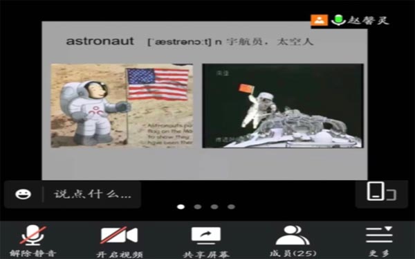 在安徽蚌埠,團(tuán)隊成員選擇了《On The Moon》這本英文繪本,為前來參加的近30位小朋友們朗讀并講解了繪本內(nèi)容,共同學(xué)習(xí)了宇航員在空中的一些有趣經(jīng)歷。同時,根據(jù)繪本為小朋友們拓展介紹了中國載人航天事業(yè)的發(fā)展歷程,帶小朋友們認(rèn)識了中國著名的航天員如楊利偉、翟志剛、費俊龍、聶海勝等,并重點講述了中國載人航天事業(yè)所傳遞出的偉大精神,即載人航天精神。最后,通過視頻回顧的方式,讓小朋友們進(jìn)一步了解到我國載人航天發(fā)展的重要歷程,充分理解載人航天精神。