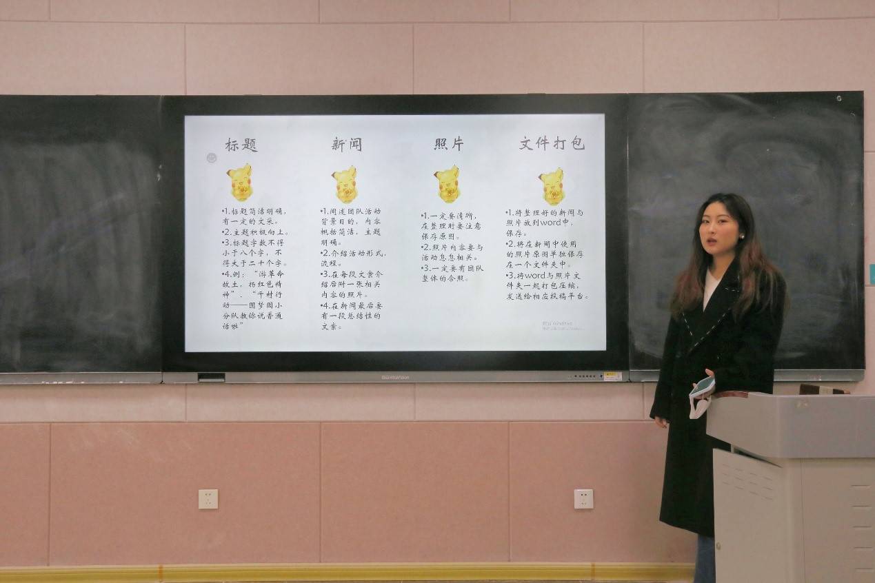 圖為實(shí)踐隊(duì)成員向大家講解稿件寫作注意事項(xiàng)。中國(guó)青年網(wǎng)通訊員 馬晨旭 供圖