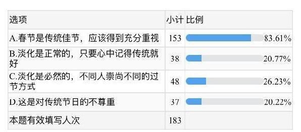 觀察以上可以發(fā)現(xiàn):大約百分之八十三的人還是有歸屬感與認(rèn)同感的,認(rèn)為春節(jié)是傳統(tǒng)佳節(jié),應(yīng)該得到充分重視;只有少部分人認(rèn)為淡化是正常的,只要心中記得傳統(tǒng)就好甚至淡化是必然的,不同人崇尚不同的過節(jié)方式。要想找到春節(jié)濃厚的氛圍,也可以做到以下一些內(nèi)容:慶祝春節(jié)時,人們期盼新年大吉,要準(zhǔn)備很多寓意吉祥的裝飾品。慶祝者們會前往寺廟,燒柱香,求個簽,了解新一年的機(jī)緣。你也想體驗一下年味的話,也可以去寺廟,求根命運(yùn)簽 。燒的香也常可以在寺廟門口找到。許一個心愿,最好求個上上簽,還可以讓寺廟里的人為你解釋簽的意味。2.及時打掃房屋,來 “除舊迎新 ”。因為中國人相信過年前,要把今年的霉運(yùn)統(tǒng)統(tǒng)掃掉,以讓家里能容納新年的好運(yùn)氣,所以每年的這個時候都會打掃房子。有的地方風(fēng)俗是把簸箕和掃帚扔掉,這樣除舊迎新更徹底一些。除了屋里干凈,保持自己形象清新也是很喜慶的,可以試一個新發(fā)型哦。不要剛過了年才打掃,比如掃地或擦窗戶。這樣做會把你在新年里剛剛收到的好運(yùn)統(tǒng)統(tǒng)掃光掉。這段時間一直到正月十五元宵節(jié),都不要掃地擦窗。這樣可能會比 平常臟一點(diǎn),但是按照傳統(tǒng)中國人的說法,能為你家積累好運(yùn)氣哦。3.裝飾你家。最推薦用紅色的裝飾品,紅色是中國文化里的喜慶色,有福氣的寓意。4.祭祀灶王爺。祭灶的時候要供點(diǎn)食物,比如水果。許多傳統(tǒng)的家庭在廚房里都會貼張灶神的畫像。5.在除夕吃頓傳統(tǒng)的年夜飯。這是春節(jié)最為重要的組成部分之一,這時吃的食物具有與中國新年相關(guān)的傳統(tǒng)意義。有的中國人在新年第一天不吃肉,因為每個新年都有一個動物的名字。其余的日子里就沒有這樣的限制了。傳統(tǒng)的菜肴包括魚、雞肉、年糕(粘米糕)、面條(長壽面)和各式甜點(diǎn)。尤其是在中國北方 ,餃子在新年的食物中扮演著特殊的角色,這是由于它們的形狀類似古中國的金元寶、銀錠子。一些食物的意義包括:白酒(一種傳統(tǒng)的烈性酒)、胡蘿卜、白蘿卜,意味著長壽。紅辣椒顏色紅艷,寓意喜氣洋洋。米飯是中國南方的傳統(tǒng)主食,含有和諧的意味。6.自己試試做中國菜。如果你不想只去你那的餐館點(diǎn)中式菜,而是想嘗試點(diǎn)新花樣、新挑戰(zhàn),那么試試這些適合中國新年的美味食譜吧。7.新年的穿著。如果你有中國傳統(tǒng)服裝,那么這段時間穿最合適不過了。春節(jié)這段時間,所有的衣服、配飾等等最好都是紅色的。穿紅色,寓意著快樂、幸福、好運(yùn)、財富和順景,帶給你生氣勃勃的精氣神。金色是另一個合適的顏色,紅、金兩種顏色結(jié)合起來,看起來會非常雅致。8.參觀旅行。春節(jié)游行節(jié)目繁多,有人放鞭炮,有人舞龍,還有其他各種新年活動。有些人裝扮成龍和獅子。中國人崇拜龍,而龍幾乎就象征著中國。舞龍和舞獅都是傳統(tǒng)中國新年的重要節(jié)目。