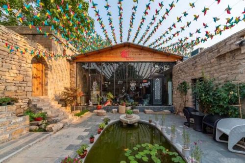 往里走便進(jìn)入了一個胡同,胡同里有石板鋪路,沿著石板路前進(jìn),一座一座的石屋吸引了我的目光,我仿佛聽到陳舊的石墻石屋在訴說著它們的過往,一塊塊形態(tài)相似的石頭組成了一座座房屋,構(gòu)成了山上最美麗的風(fēng)景線,推開一扇小院的門,院中有石磨,看樣子早已廢棄不用,粗糙的表面像是在向人們炫耀它的豐功偉績,它理應(yīng)值得被銘記。打開一間民宿的門,我感受到了濃濃的鄉(xiāng)土氣息,木桌,木椅全是由自然的樹木做成,透漏出安靜祥和,民宿與古器具形成對比,見證著時代的變遷,小院里的池塘上漂著幾株植物,不禁讓我感到心曠神怡。