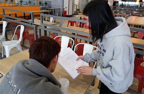 與此同時,團隊成員還與食堂就餐同學面對面地進行交流,詢問他們對小程序的看法。同學們不約而同地對線上點餐與配送模式走入學校食堂表現出了極大的好奇與歡迎。現場一位同學表示:再也不用因為避開就餐高峰而推遲吃飯時間了!另一位同學在喜悅的同時,也表達了對配送服務可能存在不及時等問題的擔憂。這些建議都將為后期小程序的優化提供了寶貴的思路。