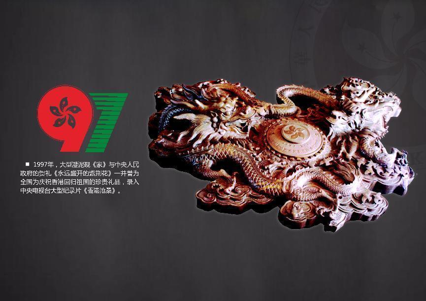 文化相傳 紫荊盛放 河洛澄泥硯藝術館由澄泥硯河南省代表性傳承人游敏始創(chuàng),共有五個展廳,分別是澄泥成硯、盛世中華、大河上下、河洛印象、汲古開新。在展館內(nèi)有多個制作精良、文化底蘊豐厚的硯臺,其中一方規(guī)格較大的硯臺,色澤光亮,氣勢恢宏。據(jù)游敏之女、澄泥硯市級代表性傳承人游曉曉介紹,該方硯臺是河洛澄泥硯藝術館代表作品《家》硯,是為迎接1997年香港回歸祖國而敬制的中國硯史上第一方大型澄泥硯。作品以其宏偉的構思、雄奇的造型、非凡的材質、精湛的技藝、豐富的內(nèi)涵、碩大的體量定格了香港回歸這一中華民族百年夢圓的偉大歷史瞬間。1997年7月《家》硯與中央人民政府贈予香港特區(qū)政府的賀禮《永遠盛開的紫荊花》一道,作為全國迎接香港回歸祖國的珍貴禮品,被錄入中央電視臺大型紀錄片《香港滄桑》中。