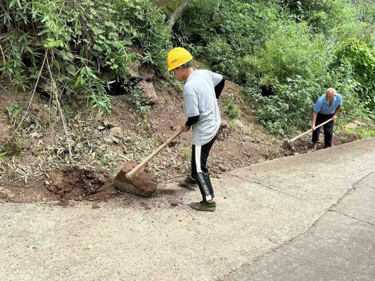 圖為村民正冒著烈日為下半年的柏油路建設做準備工作 通訊員 楊智鵬 攝