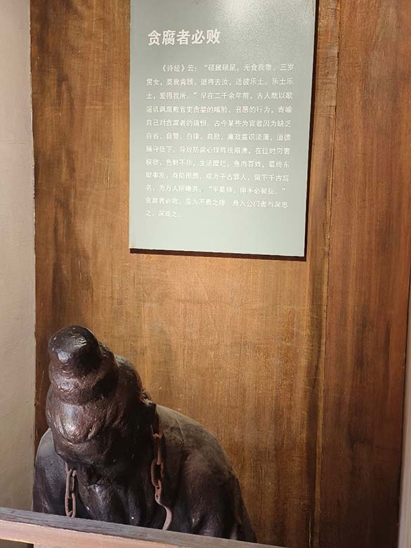 第三展廳主要關注歷代貪官污吏的典型例子,和第二展廳起鮮明的對比,正如如古代陰陽相生的思想,有清正廉潔清官也必有貪污腐敗的貪官。他們就是廉政教育的反例,貪官污吏的警醒教育也是廉政教育的重要一環,為如今人們廉政事業的批判性建設提供自省實例。
