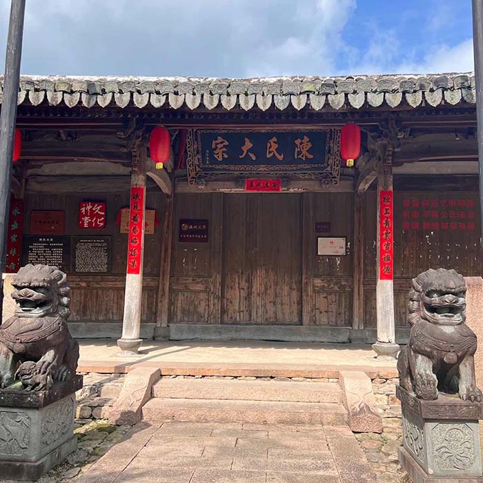 陳氏大宗祠是為紀(jì)念芙蓉建村始祖陳拱修建的,始建于宋代,后遭兵焚,明代重建,現(xiàn)有600多年歷史。大宗祠占地1800多平方米,是供奉本村始祖與列祖列宗的地方,也是血緣村落里最高品位的公共建筑,更是全村的禮教中心。陳氏大宗祠的主體建筑為七開間,兩進建筑,正廳左右為寬敞的廊間,與享堂正對著的是宗祠中最為精美的大戲臺。戲臺向院內(nèi)凸出,三面開敞臨空,便于觀眾于三個方向看戲,臺的屋頂為歇山頂,檐口高,翼角飛揚,木結(jié)構(gòu)上有雕成神仙人物的斜撐,精美的花籃柱,覆蓮式的梢子,雕工非常精美,據(jù)說像這樣的建筑,在全國也屬罕見。宗祠的正廳上方高懸著許多功名牌匾,享堂的柱上寫有許多楹聯(lián)。其中有一對柱上寫著:“地枕三崖,崖吐名花明昭萬古;門臨四水,水生秀氣榮蔭千秋”,說的就是美蓉村的鼎盛文風(fēng)和好風(fēng)水之間的關(guān)系。