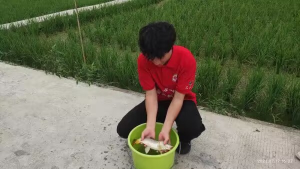 【稻花魚基地】實踐團成員深入田間,體驗稻花香“鯉”說豐年的田園風光,輕輕撥動稻穗,清除稻田中的雜草,檢查稻苗長勢與魚苗生長情況,并放入新一批優質魚苗。