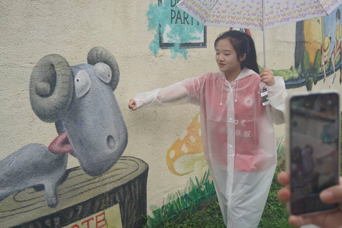 沿鄉(xiāng)間小路,實踐團成員走近一幢幢房屋,一幅幅鮮活的墻畫映入眼簾,或威武霸氣的楊家將,或活靈活現(xiàn)的動物奇緣,或?qū)m崎駿的漫畫生活……除介紹其寓意外,實踐團直播人員擺著各式各樣的姿勢,給直播間觀眾親身示范。“咔嚓,咔嚓!”類別多樣、色彩豐富的墻畫不失為一個不錯的網(wǎng)紅打卡點。