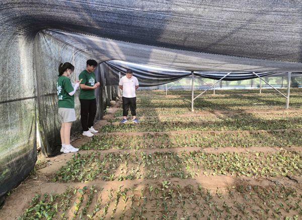 看完還在生根的小苗,張正軍還帶實踐團成員到地里看已經生根的大顆植株。實踐團成員向張正軍請教了種植方面的技巧,張正軍高興地分享了很多自己總結的經驗。面對眼前生機勃勃的綠意,讓人不禁感嘆這份來之不易的生態美。