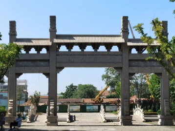 我們首先去探訪的是范公祠,據(jù)資料說,門前的大槐樹是北宋時(shí)期所植,但到現(xiàn)在依然枝繁葉茂。門口兩邊兩座石獅子,似有保護(hù)鎮(zhèn)守之意。大樹掩映下大門掛著“范公祠”三字的匾額,據(jù)資料顯示,是歐陽中石親筆著作,大門氣宇軒昂,多以石壘積而成,青磚黛瓦,匾額上方是藍(lán)黃色龍騰圖交相匯聚,與其上方綠色圖案相呼應(yīng),頗有古代建筑大門的意味。祠堂的主體采用