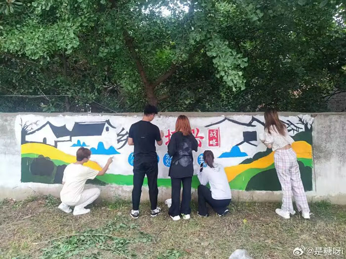團隊成員在實踐前通過與當?shù)卮逦瘯敝魅胃鸶咔嘟徽劻私獾礁鹣锎逯脖幻ⅲ鷳B(tài)環(huán)境良好,但近年來受到資源開發(fā)的影響,陸續(xù)出現(xiàn)了環(huán)境保護不到位的問題,這與團隊“治理環(huán)境、促進發(fā)展、振興農(nóng)村”主題不謀而合。此前,團隊曾派人在村內(nèi)展開調(diào)研,充分征求村民意愿,通過調(diào)查和溝通設(shè)計墻繪圖紙,采購物資,為墻繪做好充足準備。2023年7月1日團隊正式來到葛巷村展開為期7天的實踐活動。在連續(xù)三天的墻繪過程中,盡管天氣炎熱、蚊蟲叮咬以及墻面后期刷白工作量大和長時間作業(yè)帶來的疲憊等問題不斷,但團隊成員能夠克服困難,順利完成實踐。此次墻繪融合當?shù)仫L情風貌,貫徹“綠水青山就是金山銀山”的理念,用簡單的筆觸勾勒葛巷村的鄉(xiāng)土風情,結(jié)合鄉(xiāng)村振興戰(zhàn)略的“20字方針”給人以宣傳教育意義,傳達出美麗鄉(xiāng)村和創(chuàng)新發(fā)展的理念。“你們的畫作受到了村民的廣泛好評,不僅為我們葛巷村增添了活力色彩,也提高了村民環(huán)境保護的思想意識,感謝你們這幾天的辛苦創(chuàng)作。”葛巷村村委會副主任葛高青在7月4日的墻繪展覽活動上如是說道。此次墻繪展覽邀請村民前來觀看并展開環(huán)境保護宣傳,向村民傳達鄉(xiāng)村振興過程中人與自然和諧共生、綠色發(fā)展與生態(tài)保護的理念,村民對實踐團隊的道理表示歡迎,贊賞其為美麗鄉(xiāng)村發(fā)展做出的貢獻。