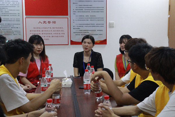 圖為溪岸社區彭錦雪書記與實踐隊隊員進行交流。陳晨 攝