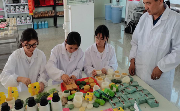 隨后,在創始人之一杰恩斯包·達坎的帶領下,團隊走進哈薩克古法手工皂制作實驗室。,團隊的每一位成員積極學習工皂的工藝制作步驟,深入了解手工皂的配方、用料配比等,為接下來手工皂的制作打下了基礎。從選擇原料、配方,到手工皂的制作成形,再到最后的脫模包裝,每一位成員參與其中,相互幫助,運用上所學到的知識和技巧對手工皂進行了創新,旨在體驗古法手工皂的制作過程,真切地從實踐中感受企業的實驗操作的嚴謹與認真。