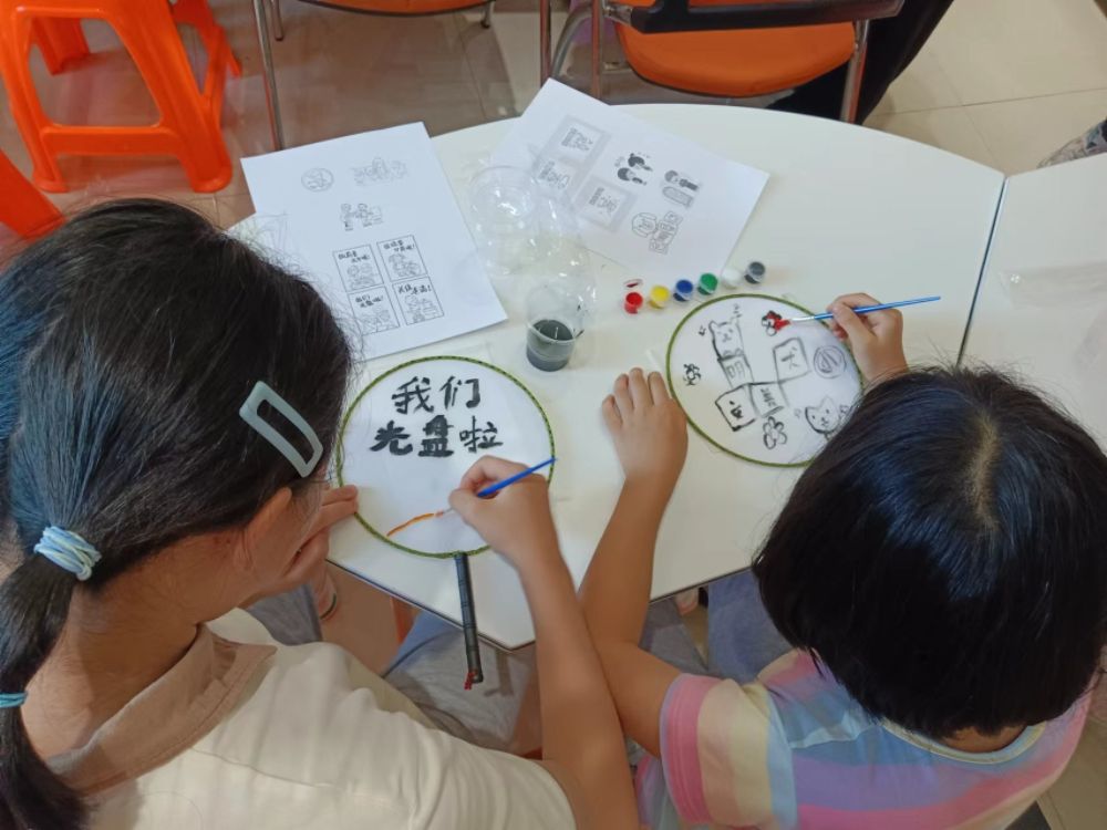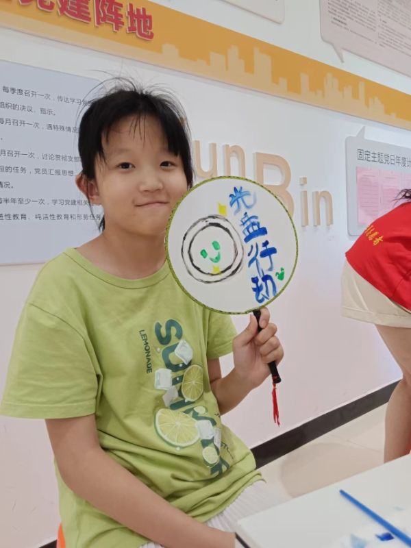 這一過程中,每個孩子都沉浸地投入到創作中,團扇上“光盤行動”“文明養犬”的字眼,展現了他們在這堂課上的所得所獲。最后,宣講同學邀請了幾個小朋友展示自己繪制的團扇,分享他們在課堂上的感悟。