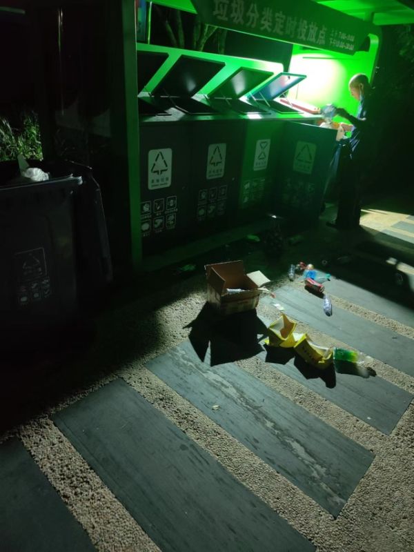 在與居民交流的過程中,實踐團得知:一些生活困難的老人常在夜間翻找垃圾桶,試圖尋找廢品賣給回收站。但他們大多缺乏環保意識,在翻找過后往往不會將垃圾重新投入正確的桶中,甚至對翻找后散落一地的垃圾視若不見。這樣的行為不僅加大了垃圾分類的難度,破壞了小區形象,同時也消磨了其他居民分類垃圾的熱情。