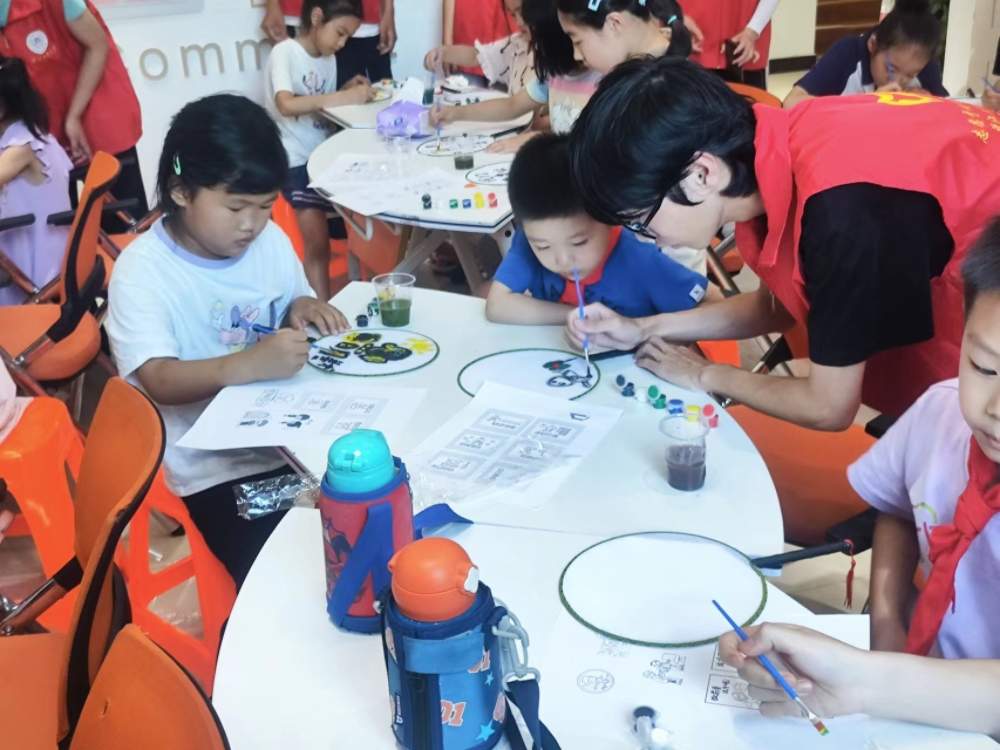 熱火朝天的討論后,宣講同學開始對團扇文化進行講解,講述了它的由來與發展,以及與團扇相關的禮儀。講解完畢后,實踐團成員向小朋友們分發空白團扇和顏料,并協助他們一起創作與文明禮儀有關的團扇圖案。