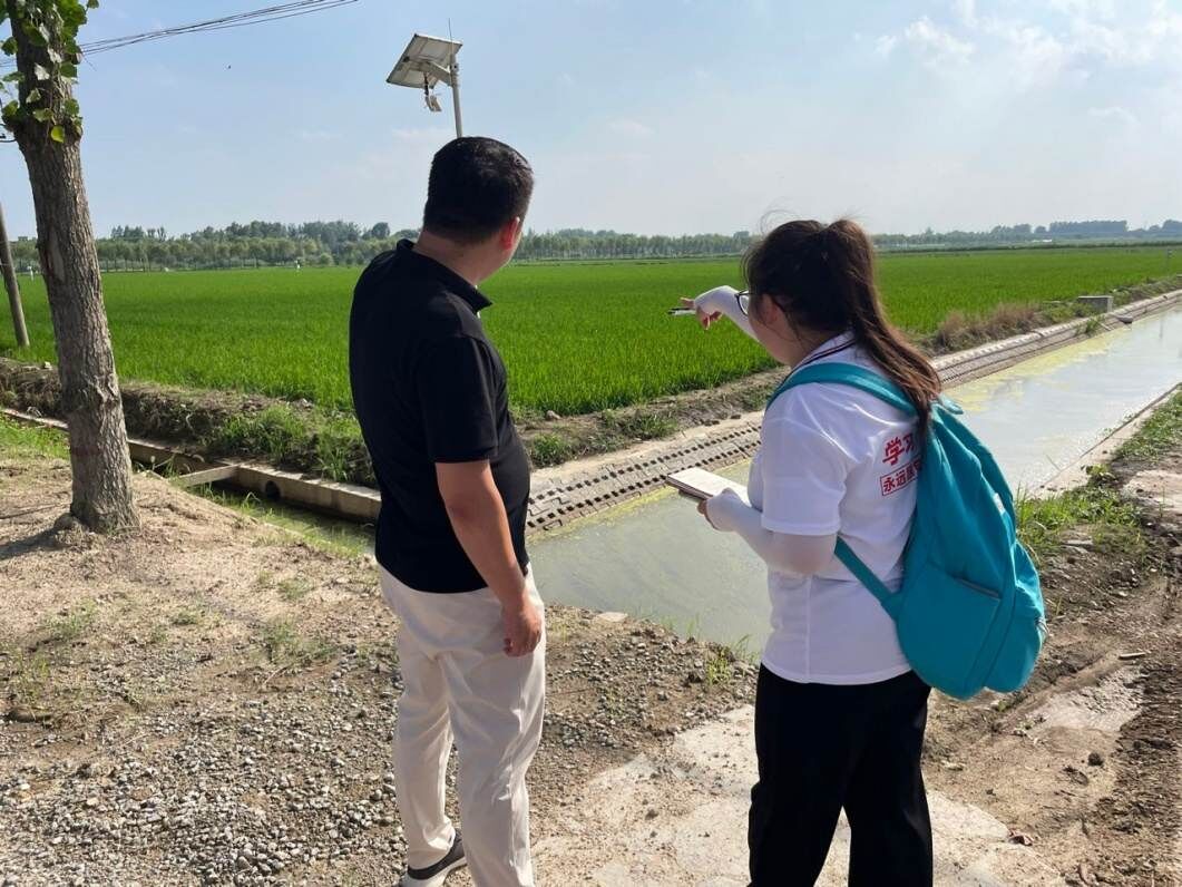 圖為調研團隊員在當地黨委副書記的帶領下學習稻蝦種植生產相關知識。多彩大學生網通訊員 丁曉陽 攝