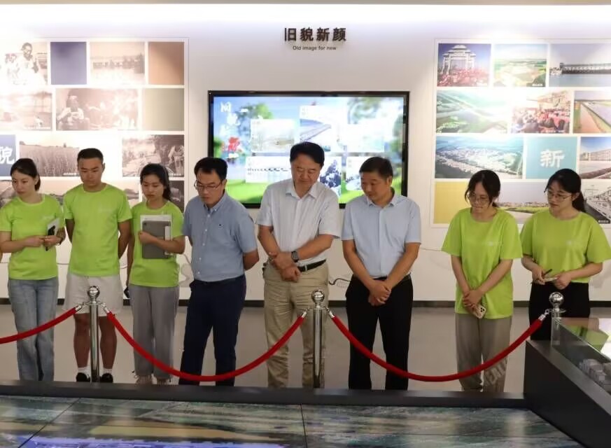 在和當(dāng)?shù)卮迕竦淖咴L交流中,我們對(duì)于王家壩閘的基本情況以及王家壩精神有了初步了解。而后,團(tuán)隊(duì)成員則懷著崇敬的心情來到王家壩抗洪紀(jì)念館參觀。進(jìn)入館內(nèi),如同打開一部淮河抗洪救災(zāi)歷史畫卷。首先映入眼簾的是大廳地板上一條蜿蜒曲折的縮小版“淮河地圖”,淮河起源于河南南陽桐柏山,跨越豫、鄂、皖、蘇、魯5省40個(gè)市,流域面積高達(dá)27萬平方公里。伴隨工作人員的詳細(xì)講解,我們沿著淮河一步步逆流而上,800多年來有關(guān)淮河抗洪的驚險(xiǎn)與奮爭(zhēng),如電影般一一展現(xiàn)在眼前。