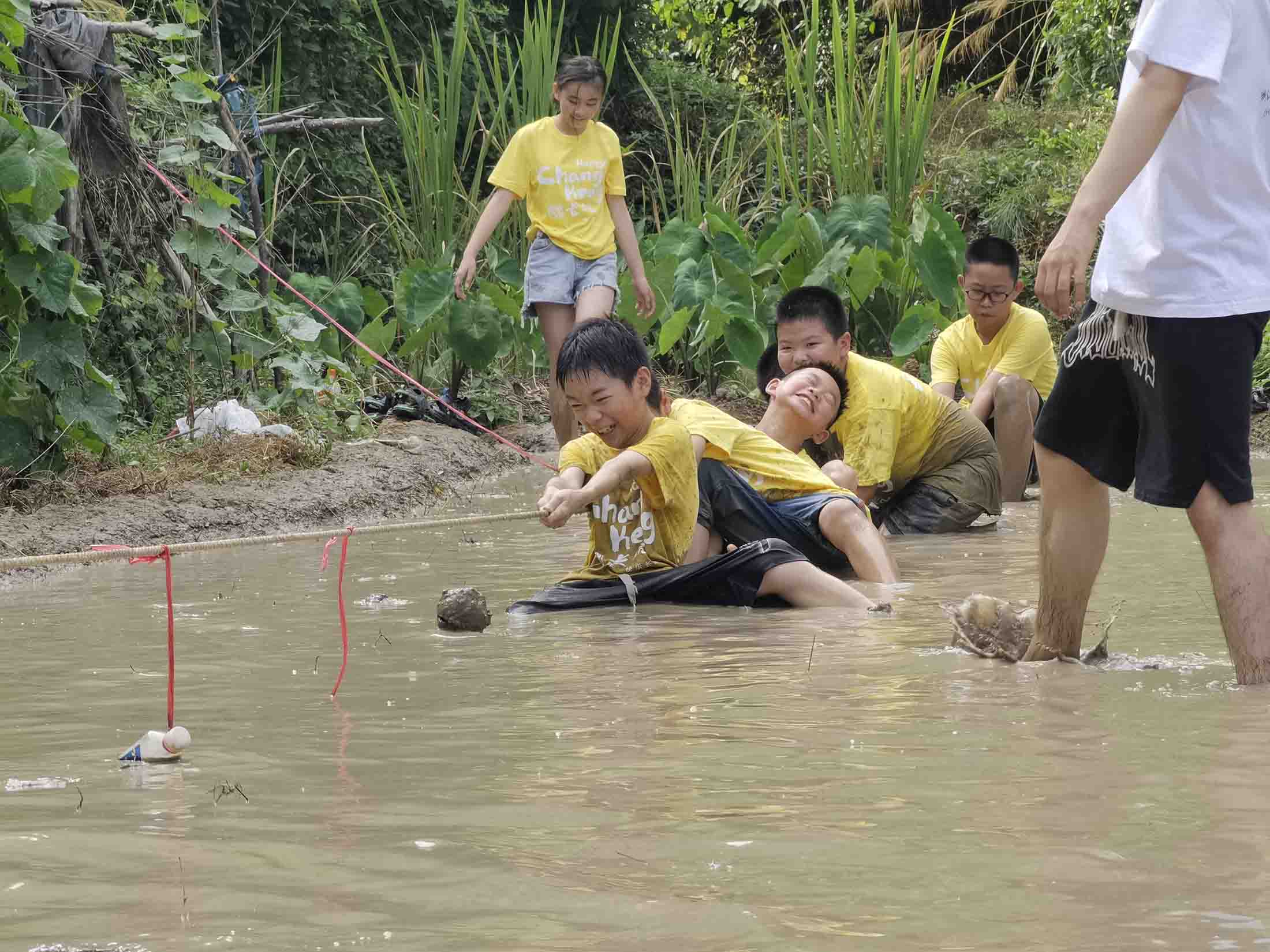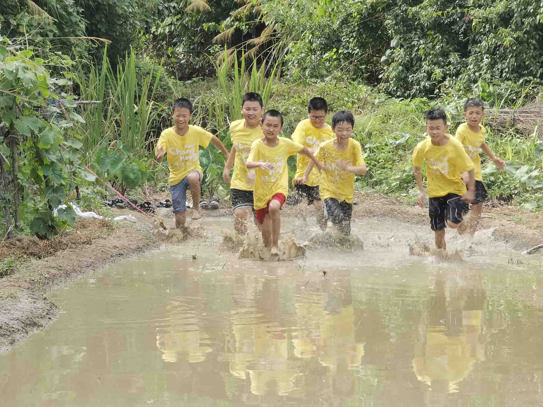 午休后,隊員們開始了下午的旅程。隊員們再次帶著同學們來到泥田,體驗了這獨特的旅程。隊員們沿著山中的小路,帶著同學們緩緩登上山腰直到一片泥潭出現(xiàn)在隊員們眼前。起初,孩子們猶豫著如何下泥田,擔心泥田會弄臟他們的衣服褲子。隨著第一個勇士猛的踩進泥田,并呼喊著邊上猶豫的孩子們。大家便紛紛涌入泥田,從試探的步伐到在泥田里奔跑。當孩子們都適應泥田后,便開始游戲了。第一個游戲是泥田賽跑。同學們歡聚在泥潭的一側(cè),興致高昂,準備迎接這個挑戰(zhàn)。隨著一聲哨響,隊員們揮動著鮮艷的旗幟,給同學們發(fā)出起跑的信號。一瞬間,泥潭中熱火朝天。同學們?nèi)缑擁\的野馬,迅速撒開雙腿,全力向前沖刺。他們大幅度地跨開雙腿,腳踏泥土,激起一陣陣泥漿的噴濺。有的同學穩(wěn)健而堅定,跨步有力,與大自然的韻律完美融合。有的同學竭盡全力,汗水伴隨決心奔騰,每一步都印上力量的烙印。泥漿濺起,彌漫著令人陶醉的清香。同學們?nèi)橥度耄活櫼磺械刈分鸾K點的勝利。