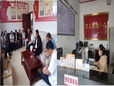 圖為村干部組織村民開環(huán)境清潔會議和實習實踐工作展示