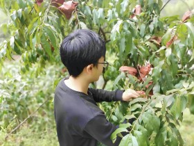 黃桃是當地一項重要經濟來源,所以村民們都十分愛護這些果樹。負責介紹的村民一邊示范一邊給我介紹:給黃桃套袋可以提高外觀品質,減少蟲害侵蝕。套袋一般要在完全謝花,坐果穩妥,等果實長到有乒乓球大小時進行,因為這個時候果實堅硬且沒有蟲害,是最佳的套袋時間。而現在果實成熟,正是采摘黃桃的時候。我照著村民教的方式采摘,勞作一上午確實很累。同時隨著一次次采摘,動作也越來越熟練。