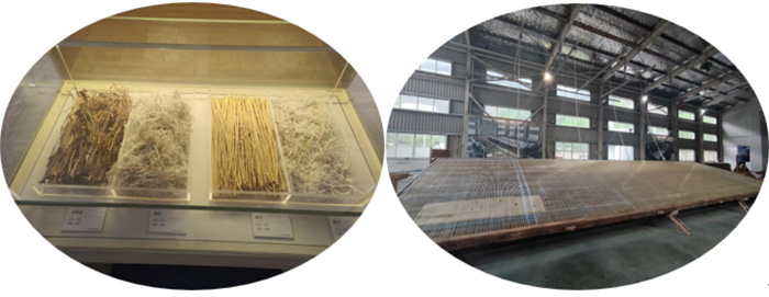 在參觀宣紙文化園期間,團隊了解到,宣紙的制作主要依靠三個關鍵步驟:原料選材、漿煮和添料調配,以及紙張晾曬。首先,制作宣紙的原料主要是由涇縣及周邊地區青檀皮和沙田稻草等天然植物纖維制成。而漿煮和添料調配是保證宣紙質地的關鍵步驟,需要嚴格按照比例進行操作。最后,紙張在晾曬的過程中,需要經過多次翻動,以確保紙張的平整度。這一過程中的每個環節都需要專業工人的巧手和細心,這也正是宣紙獨特魅力的所在。在參觀宣紙文化園過程中,為了更直觀的了解宣紙的制作過程,團隊來到了“三丈三”巨宣車間。“三丈三”超級宣紙,是迄今為止世界上最大的手工宣紙長11米,寬3.3米,需40余人同時撈制。里面展示了撈紙、曬紙、剪紙的車間制造狀況,可以看到巨宣的制造規模是非常巨大的,造紙人的辛勞也不言而喻。