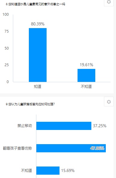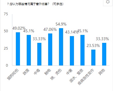 調查數據顯示,半數的被訪者認為燒、燙傷、貓狗咬傷、跌落、溺水、中暑屬于意外傷害,20%的被訪者不知道溺水是兒童最常見的意外傷害之一,50%的被訪者認為兒童跌落后應該采取翻看孩子傷勢這種錯誤作法,25%的被訪者不知道急性扭傷后如何處理,48%的被訪者不知道海姆立克急救法及不了解心肺復蘇的相關操作,59%的被訪者僅對燙傷后的處理方法了解一點,但采用錯誤的處理方法居多,例如:使用牙膏、醬油等敷在創面上。