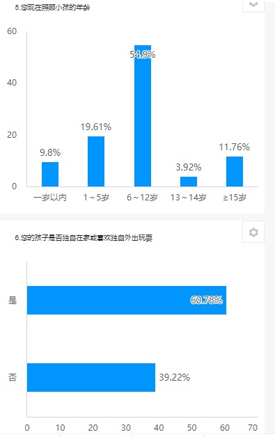 調查數據顯示:在被調查者中,年齡段在7-18歲的占33%,18-30歲占12%,30歲及以上55%.文化水平在大專或本科以上的占10%,高中占8%,初中占37%,小學占45%。所帶小孩個數為3個和4個及以上的占比最多,分別為18%和24%。其中隨訪人員中其孩子年齡以6—12歲為主,占比55%,有61%的被訪者認為自家孩子經常獨自在家或獨自外出玩耍。