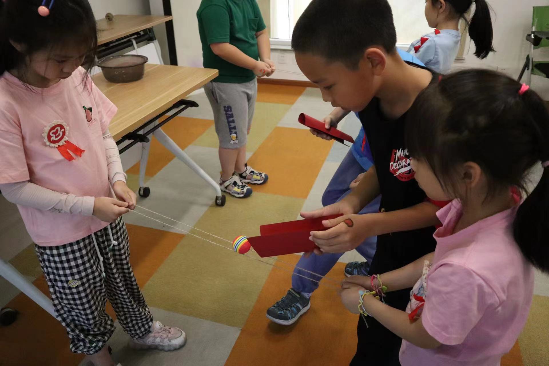 接下來開展的是乒乓球運輸大作戰,這項游戲的難度更高,更加考驗小朋友們的團隊協作能力以及協調能力,一開始由三位同學通過紙板來運輸乒乓球,再由最后一位同學將乒乓球運至細繩上,由兩位同學通過細繩將乒乓球運至框內,每個同學都是小心翼翼的,生怕球從自己的手中溜走。場內很安靜,好像聲音一變,大球都會被嚇跑一樣,但當球運至最后一環節時,前面一環節同學又忍不住躁動跑向后方觀看,最后兩位同學的操作并為他們加油吶喊,但這時候有一個小小的插曲出現了,由于最后兩位同學始終不能通過細線夾住小球而產生了一些小矛盾,他們有些埋怨對方,認為是對方操作的問題,才遲遲不能將小球運起,一旁的點點老師看著這一場景,上前詢問著兩人,并開導她們,她們也很快明白問題所在。我想舉辦這場運動會的意義,在這一刻真正體現了出來。