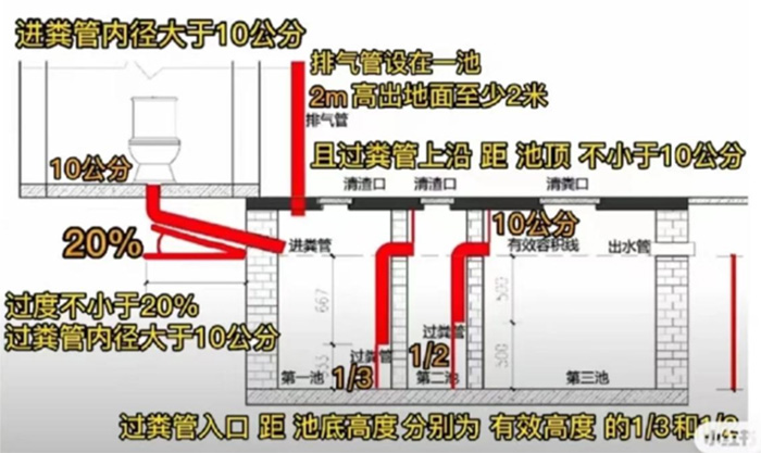 三格式化糞池每格的作用也各不相同。第一池主要起截留糞渣、發酵和沉淀蟲卵的作用;第二池起繼續發酵的作用;第三池主要起發酵后糞液的貯存作用;三個小池的主要功能依次命名為:截留沉淀與發酵池、再次發酵池和儲糞池。