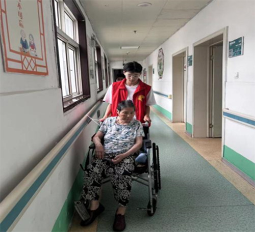 (圖為2023年6月23日,“杰出青年,愛使我行”團隊仕蘇成陪伴老人散步)
