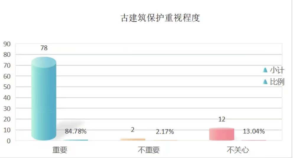 根據(jù)圖片顯示,從本次的調(diào)查結(jié)果來看,常州市居民在總體上較為重視焦溪古建筑的保護(hù),對(duì)中國(guó)的古建筑保護(hù)修繕工作較為重視。其中有78人認(rèn)為保護(hù)中國(guó)傳統(tǒng)建筑,使其在新時(shí)代發(fā)揮應(yīng)有的價(jià)值是一件有意義的事情,占比84.78%;只有2人認(rèn)為修繕古建筑是一件沒有意義、沒有價(jià)值的事情,占比2.17%;有12人表示對(duì)國(guó)家的古建筑事業(yè)并不關(guān)注,占比13.04%。“團(tuán)結(jié)就是力量,團(tuán)結(jié)才能勝利。全面建設(shè)社會(huì)主義現(xiàn)代化國(guó)家,必須充分發(fā)揮億萬人民的創(chuàng)造偉力”全體人民的團(tuán)結(jié)是中國(guó)社會(huì)各方面蓬勃發(fā)展的重要秘訣,在漫長(zhǎng)的歷史長(zhǎng)河中,中國(guó)人民團(tuán)結(jié)一心、同舟共濟(jì),建立了統(tǒng)一的多民族國(guó)家,共同培育了偉大精神。中國(guó)古村落建筑保護(hù)事業(yè)任重而道遠(yuǎn),需要全體中國(guó)人民報(bào)以極大重視,團(tuán)結(jié)起來,共同取得成就。