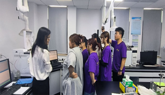 圖為實(shí)踐團(tuán)隊(duì)同學(xué)正在聚精會(huì)神的聽取老師對(duì)于液相色譜-質(zhì)譜聯(lián)用儀的介紹。 多彩大學(xué)生網(wǎng)通訊員 高勇 攝