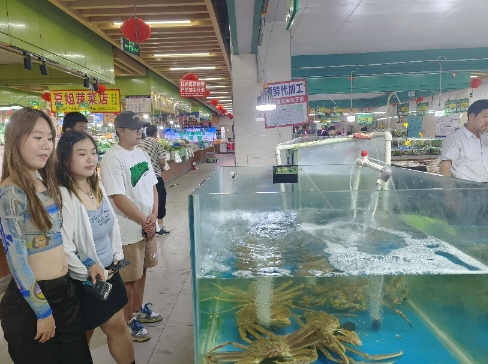 然而,考察期間正值休漁期,使得積米崖碼頭的開放時間相對有限。在金沙灘海鮮市場,實踐隊員通過與商販的交談,深入了解了種類豐富的水產品,涵蓋鮮活海鮮、加工制品、干貨等。調研還揭示,青島市場主要以魚類、蝦類和貝類為主要銷售品種,新鮮海鮮備受消費者歡迎,同時特色加工產品也頗受青睞。除了新鮮海鮮,特色加工產品也備受歡迎。從蟹黃包到魚丸,這些特色加工品以其獨特的口感和制作工藝吸引了消費者的關注。這不僅豐富了市場選擇,也為養殖業的產業鏈延伸提供了新的方向。