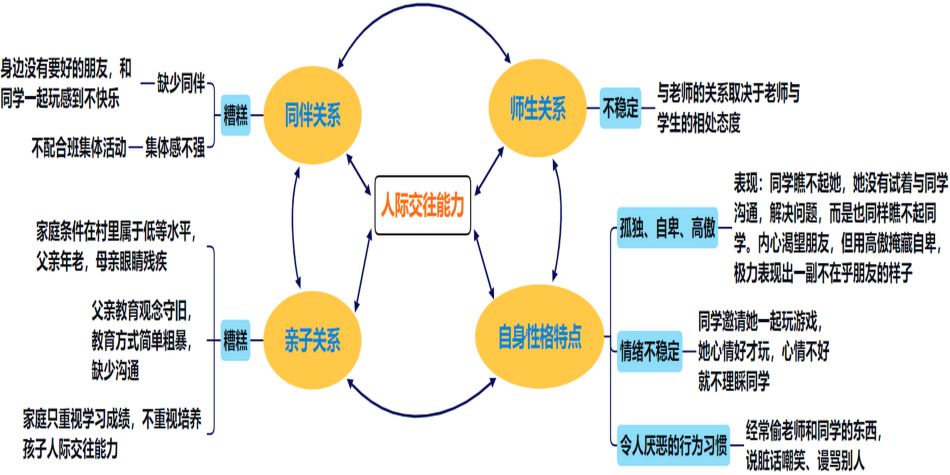 T4:我認為有先天因素的影響,也有后天因素的影響。家庭教育在后天因素中占比很大,比如獨來獨往的S1的家庭教育就不太好,她的爸爸經常護著她,她和同學發生矛盾時,她的爸爸尚未弄清原委和經過,便直接責怪同學。她的爸爸不懂得溝通,不教授給她溝通的知識和技巧,所以她也形成了不懂得溝通的性格。