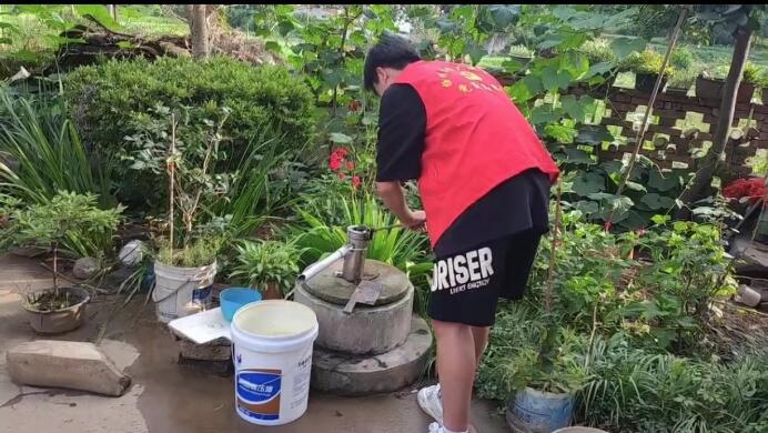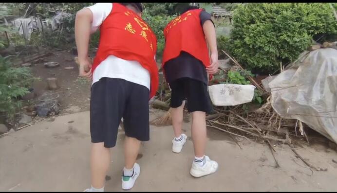 圖為團隊成員徐文浩和韋自然一起幫助老人打掃院子。