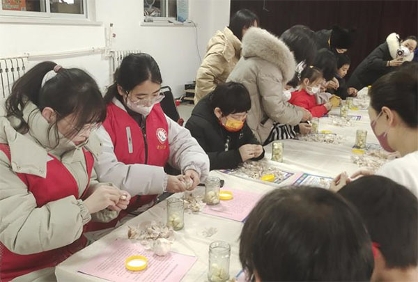 實踐過程中,隊長徐炳芳同學帶領實踐團隊與軍學社區黨支部共同開展了“甜甜中國味,濃濃臘八節”年味主題活動。實踐隊員與社區工作人員生動介紹了“臘八節”的源起和傳統習俗,同時積極引導孩子們參與臘八節的傳統體驗活動,指導孩子如何扒蒜皮、倒醋、進行密封等傳統技藝。通過實踐操作,讓孩子們感受到傳統文化的獨特魅力,培養了孩子們的實用技能,為社區文明傳承和教育培養注入了新的活力。