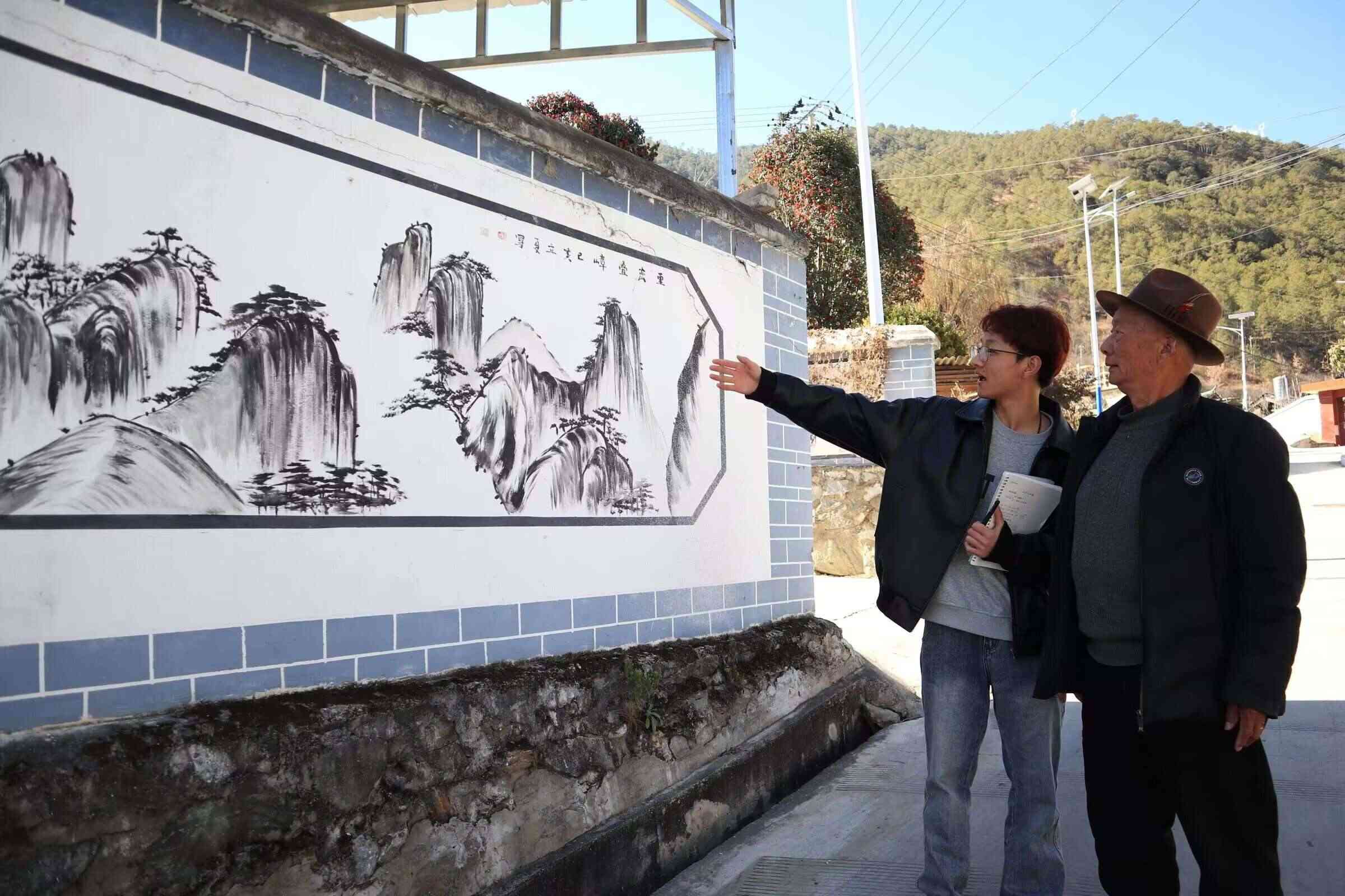 圖為實踐隊員與村內村民一同欣賞村內文化墻。文化墻設計融合了當地特色文化,展現了閆家溝村人積極向上的精神面貌。